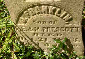 information on Findagrave.com James Franklin Prescott Birth: unknown Death: Oct. 21, 1863 Obit from the American Citizen Jackson Michigan 18 Nov 1863: James Franklin Prescott died 21 Oct 1863 age 7 yrs 6 mos 7 das. Only children of E E & Matilda Prescott. Three others have recently died. Inscription: son of E.E. and M. Prescott - age 6 yrs 6 mo 7 da Burial:: Nims Cemetery Pleasant Lake Jackson County Michigan, USA -gives dob of 14 Apr 1857 MI is J. Franklin son of E.E. & M. Prescott died Oct 21 1863 aged 6 years .....