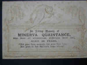 Memorial card states In Loving Memory of Minerva Quaintance Who Died at Aylesbeare, February 26th 1885 Aged 38 Years "Not gone from memory, not gone from love, But gone to her Saviour's home above"
